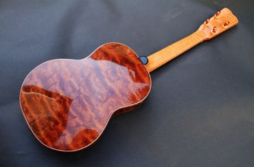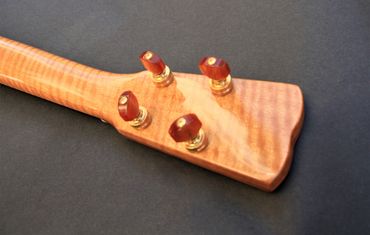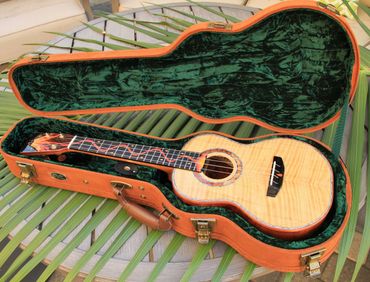 Top, Back, and Sides are well aged, figured Koa. Bracing is quarter sawn spruce for maximum flex to strength ratio. Fretboards and Bridges are Ebony, and Necks are of a multilaminate of Koa, Maple, Mahogany, Maple and Koa for stability and strength. The necks are fixed and bolt on for long term stability and viability of the instruments. The bridges are a "string through body design" to maximize vibration of the tops and they are a mountain shape to keep to the theme of the instruments. The nut and saddle are polished bone.