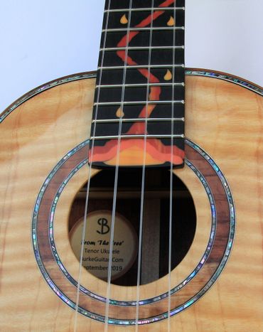 The peghead shape allows for non-binding string setup for the smooth Waverly Tuners. It is inlayed with an erupting volcano (Lua Pele) combined with a dark sky and wooded mountain. It contains a player's sound hole on the side to enhance sound to the player.
