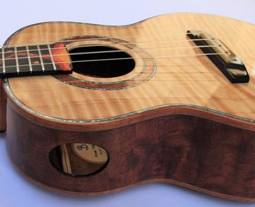 This Custom Instrument has a 20” scale length with 19 frets tuned to DGBE. It has a K&K Aloha Twin double sensor pickup. A 15’ arch on the back, quarter sawn split braces, and solid linings increase volume and sustain.
