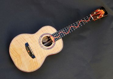 Here is wonderful Custom Tenor Ukulele. This ukulele sings great, plays easy, and looks wonderful.The Wood – The back and sides are made from figured walnut with the soundboard being fine grain, highly figured, old growth Port Orford Cedar. It has Rosewood fretboard, a 5-layer neck of Mahogany and Rosewood, an Ebony bridge. Top binding is Koa with W/B purfling and Abalone inlay, bottom binding is B/W/Koa. The Look – The Port Orford Cedar top has its own unique beauty, The figured ebony with Abalone inlay rosette goes perfectly with the coloring in the top and the koa/abalone binding. The saddle and nut are bone. The hand rubbed walnut finish feels great in the hands.Quality Components and Build – On top of the wonderful tonewoods chosen for this instrument, it has a sound port for the player, Waverly tuners, and medium frets on a 17 1/32 scale length. It has fret markers, side markers, and is finished in satin nitrocellulose lacquer.